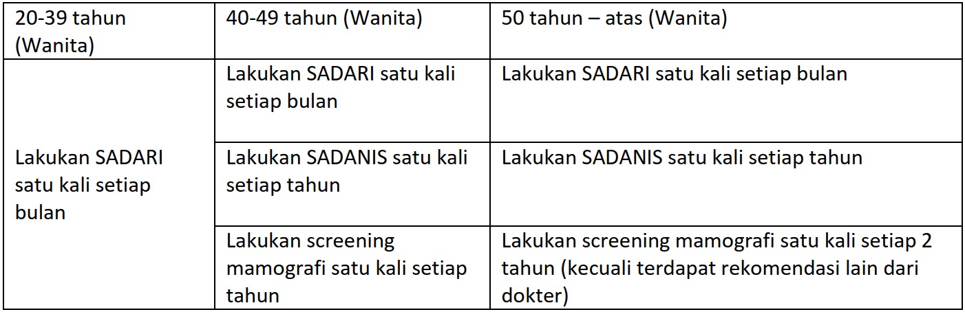 Secara umum, terdapat 3 kategori rekomendasi deteksi dini kanker payudara berdasarkan umur, yaitu: