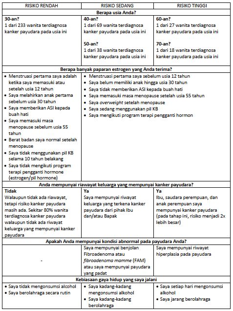Setelah Sobat mengetahui berbagai faktor risiko yang berperan dalam kanker payudara, maka Sobat dapat menilai sendiri apakah Sobat termasuk berisiko rendah, sedang, atau tinggi terhadap kanker payudara. Untuk membantu Sobat, ICCC merangkum beberapa poin pertanyaan dan penjabaran faktor risiko yang disebutkan di atas. Sobat dapat menggunakan tabel ini juga ketika hendak bertemu dan berdiskusi bersama dokter mengenai rencana deteksi dini atau pencegahan kanker payudara yang perlu Sobat jalani. Yuk, cek tabel di bawah ini: