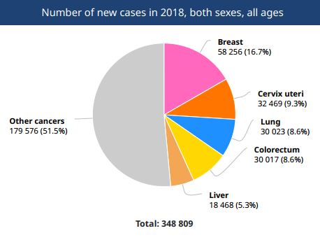 Menurut laporan terbaru dari The Global Cancer Observatory (GLOBOCAN) 2018, jumlah kasus baru kanker di Indonesia mencapai 348.809 kasus dan jumlah kasus kematian kematian akibat kanker mencapai 207.210 pada tahun 2018. Angka ini diprediksikan akan semakin meningkat pada tahun 2040, yaitu dengan kasus baru mencapai 580.000 kasus dan kematian akibat kanker mencapai 370.000 kasus. Dari total insiden kasus kanker yang ada di Indonesia, kanker payudara masih menempati urutan teratas, diikuti oleh kanker serviks dan kanker paru-paru.